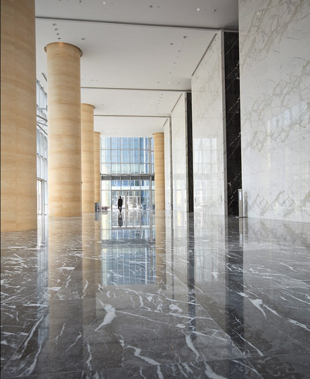 The 26-story commercial office building is situated in Jakarta’s esteemed business and embassy district. The project’s iconic design is a straightforward angular shape that fuses iconic imagery with floor plate efficiency. In order to achieve a striking form balance, the chiseled-diamond form uses a simple curtain wall with contrasting vertical and horizontal mullions. Meanwhile, the randomly balanced forms extend to the interiors, where natural stone is used in an elegant and roomy lobby.