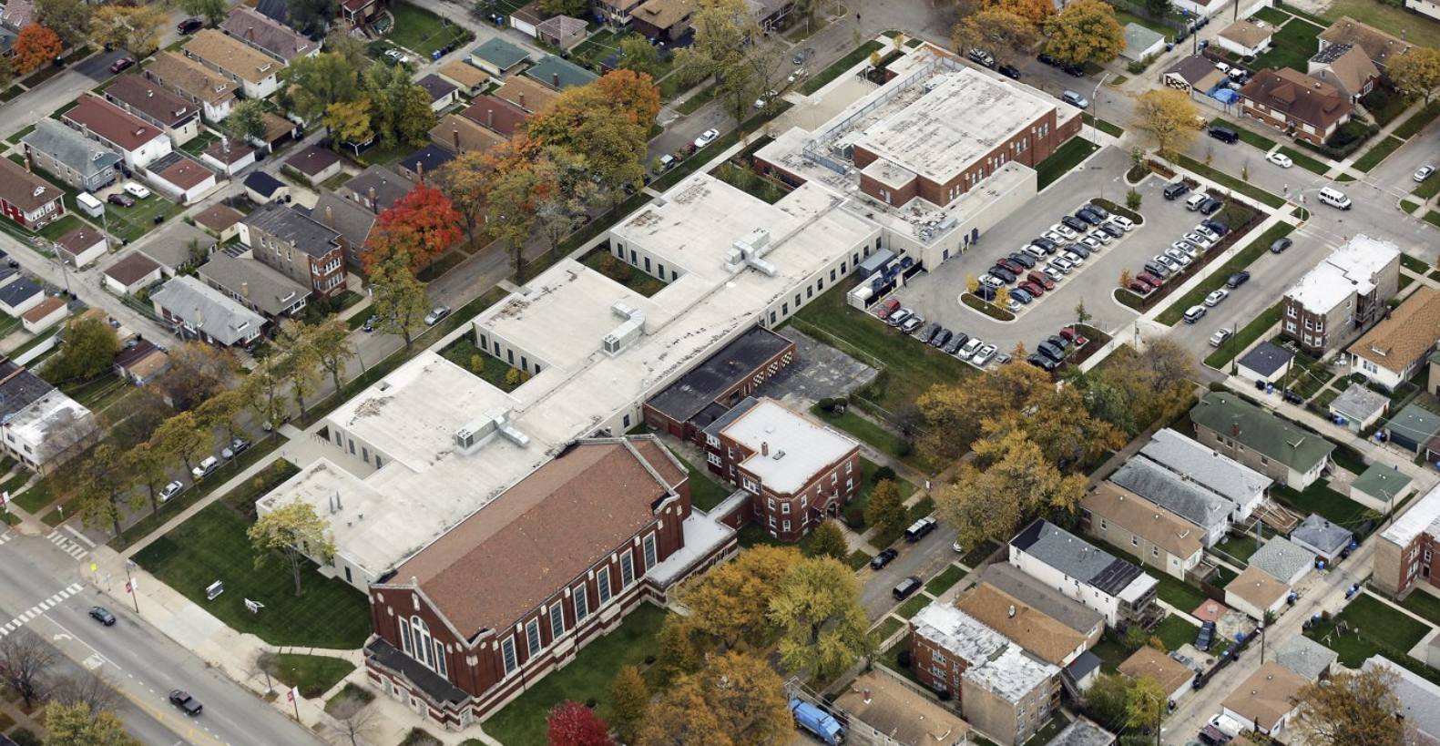 Hansberry College Prep is situated in a Chicago neighborhood with the highest dropout rate. It was established thanks to an innovative collaboration between the Noble Network of Charter Schools and another nonprofit. A dilapidated parochial school gymnasium building became the cornerstone of a new 1,100-student high school situated on grounds spanning an entire city block. The former school building is now quadrupled in size thanks to a single-story addition interspersed with three courtyards facing the street.