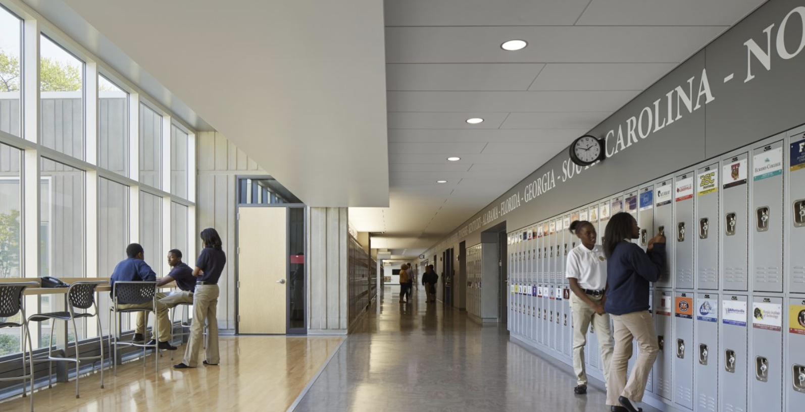 Rustic courtyards provide natural light and seasonal color into the classrooms, offering a wide variety of learning environments instead of the double-loaded corridors found in typical district high schools.