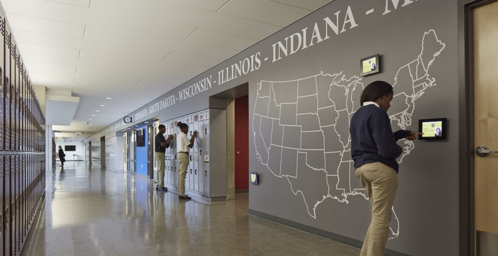 A 370-foot hallway acts as a “college corridor,” with lockers encircling a central alumni map and 435 college logos arranged geographically from end to end. Digital displays surrounding the map, which shows the US and an expanded version of the Midwest, scroll the biographies of current and former faculty and alumni. Students enrolled in Hansberry can peruse the condensed biographies of faculty members or previous students who overcame similar obstacles to gain admission to the colleges marked on the map.