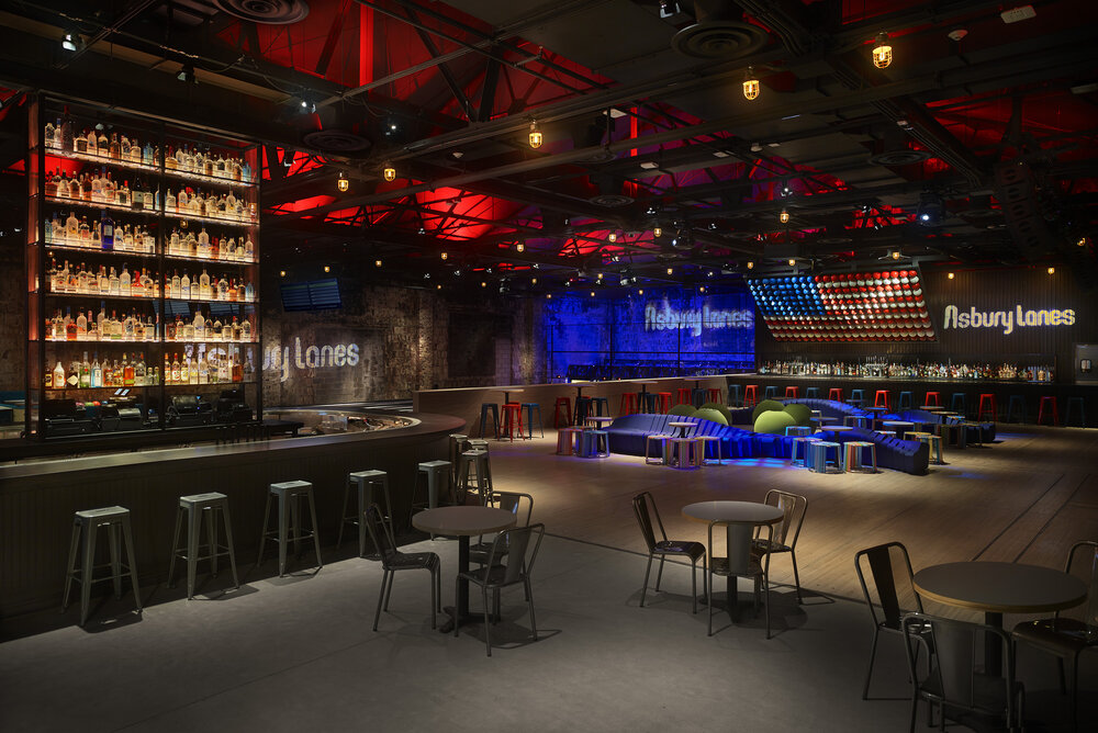 The renovation of a famous bowling alley from the 1950s into a mixed-use entertainment area with two bars, a café, a performance stage with state-of-the-art lighting and sound equipment, and six additional bowling lanes.