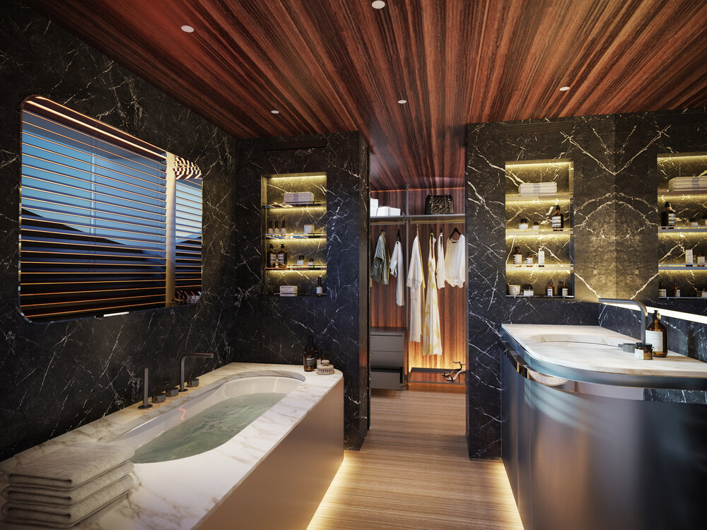 Working together with British yacht designers RWD, who developed the framework, the company designed rooms with the intention of evoking a sense of serenity. The rooms are finished with materials that have a high-end feel to them and will hold their character over time.