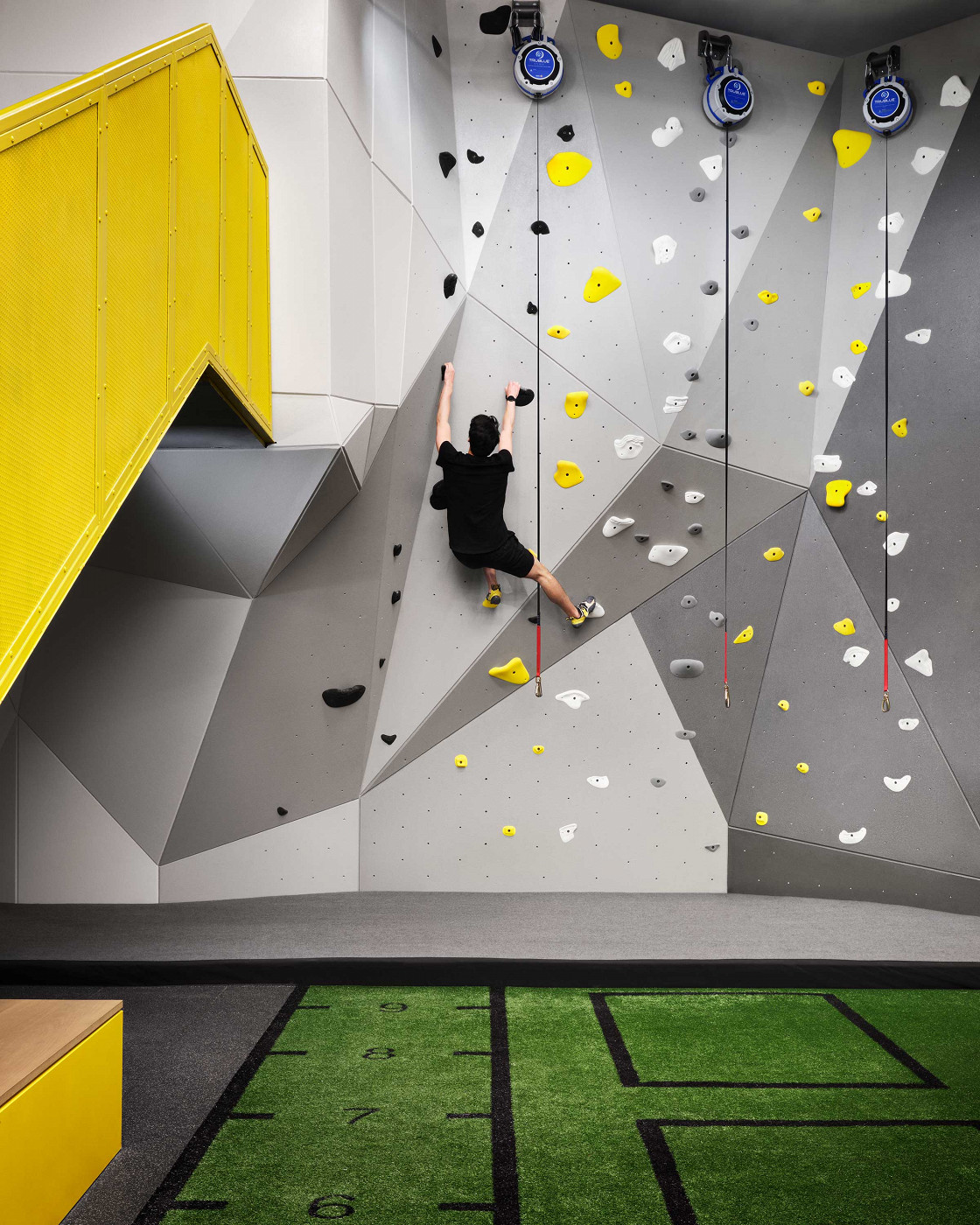 The amenity areas flow into one another with ease. They consist of a café and a co-working space, each set apart by a specially designed layout that serves its function and is complemented by unique lighting and artwork. Existing amenities were doubled in size thanks to found space; in the subbasement, for instance, a disused oil tank was removed to make way for a double-height fitness center with a yoga room and climbing wall. The kids’ room features a built-in playhouse and a miniature climbing wall.