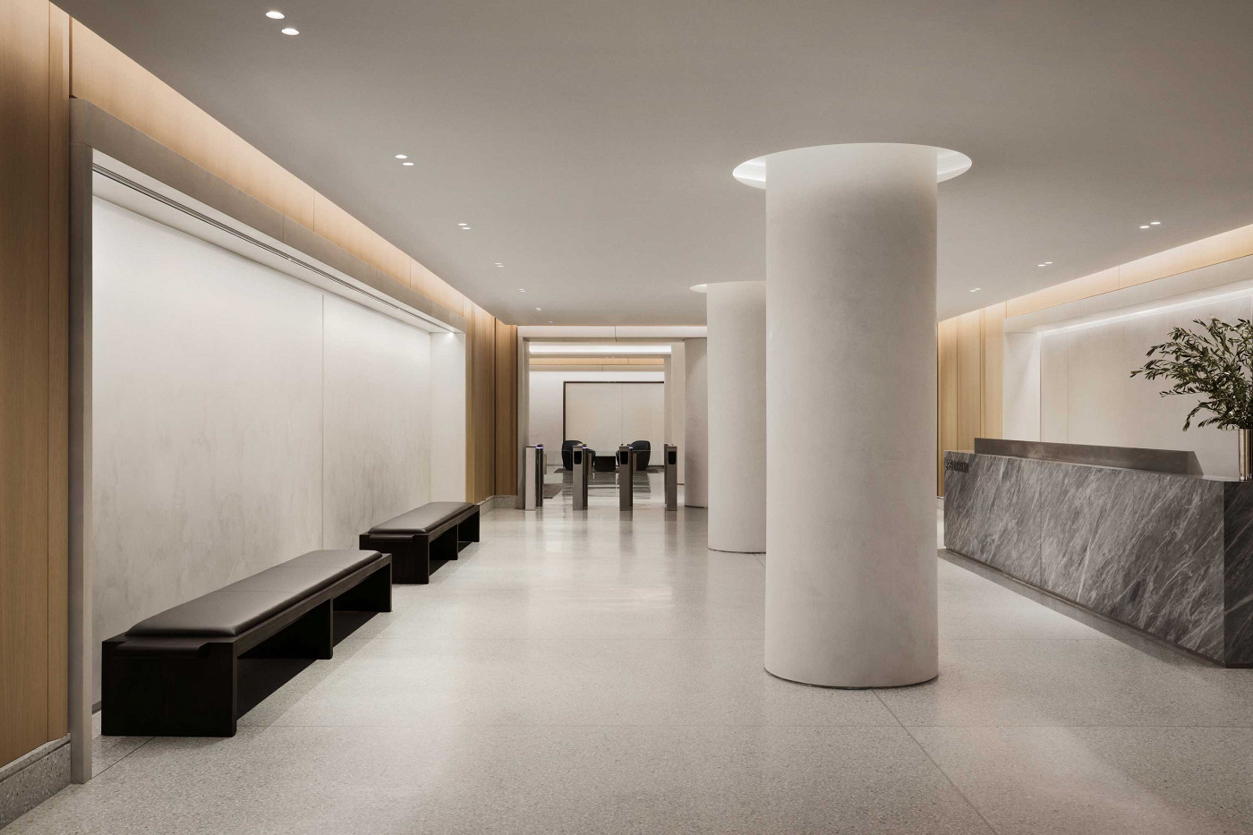 The double-height entry, once overly busy, has been transformed into a sleek, sophisticated, light-filled area. White oak veneer panels, twelve feet high and free of knots, were sourced in cooperation with union millworkers and used to cover the walls. The original dark wood flooring was completely replaced with durable, textured terrazzo. Etched mirror-backed glass applied to walls, in addition to wood and stone, captures the movement and energy of people passing by.