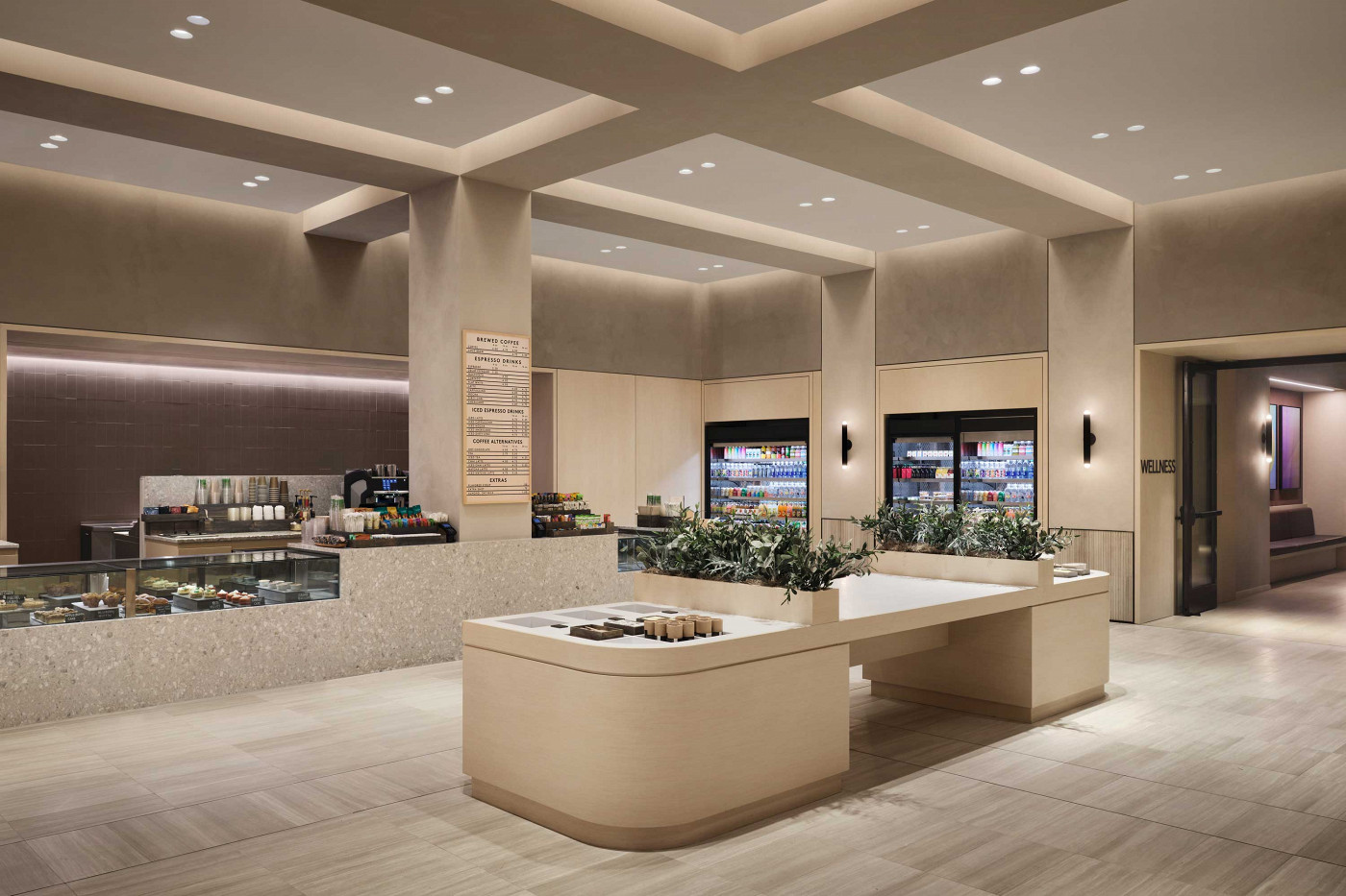 The residential units, finished in neutral tones, are equipped with cutting-edge conveniences and appliances. Some units have been outfitted in collaboration with the wellness and technology startup Delos. These units include features like water filtration systems, air purification, and circadian rhythm-like lighting that can be controlled via an app. Residents can also use concierge services for help with errands, services, and food delivery from a restaurant on the first floor, which they can enjoy outside in a public garden tucked away at the back of the property.