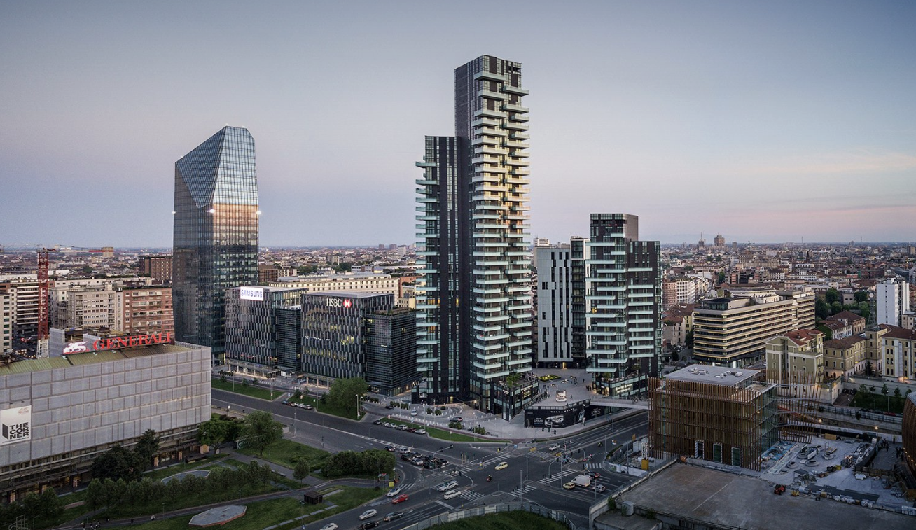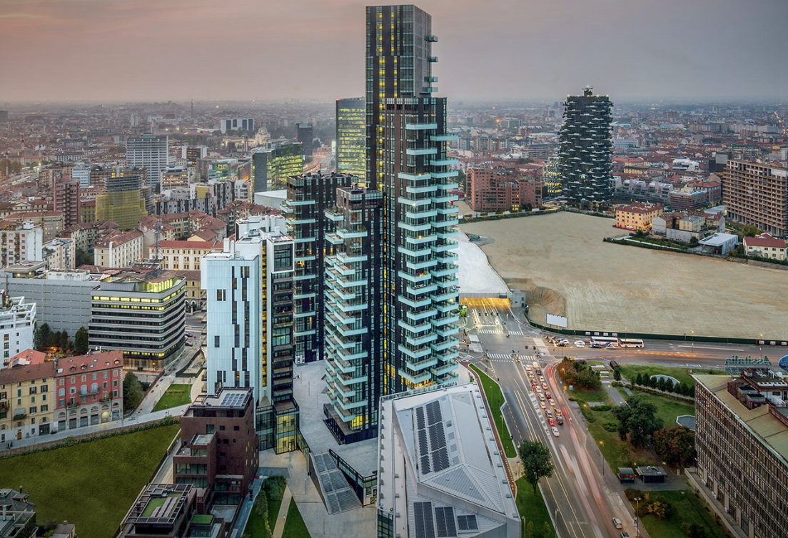 The project, which features two towers designed by Arquitectonica, offers Milan’s first taste of high-end residential high-rise living. With floor to ceiling glass, Solaria and Aria provide world-class views of the city center below and the Alps. The project is shaped like three rectangular solids coming together to form a triangular void. The complex’s central core provides ventilation and light. Every residential unit has views of the Alps and Milan’s Duomo from three of its sides.