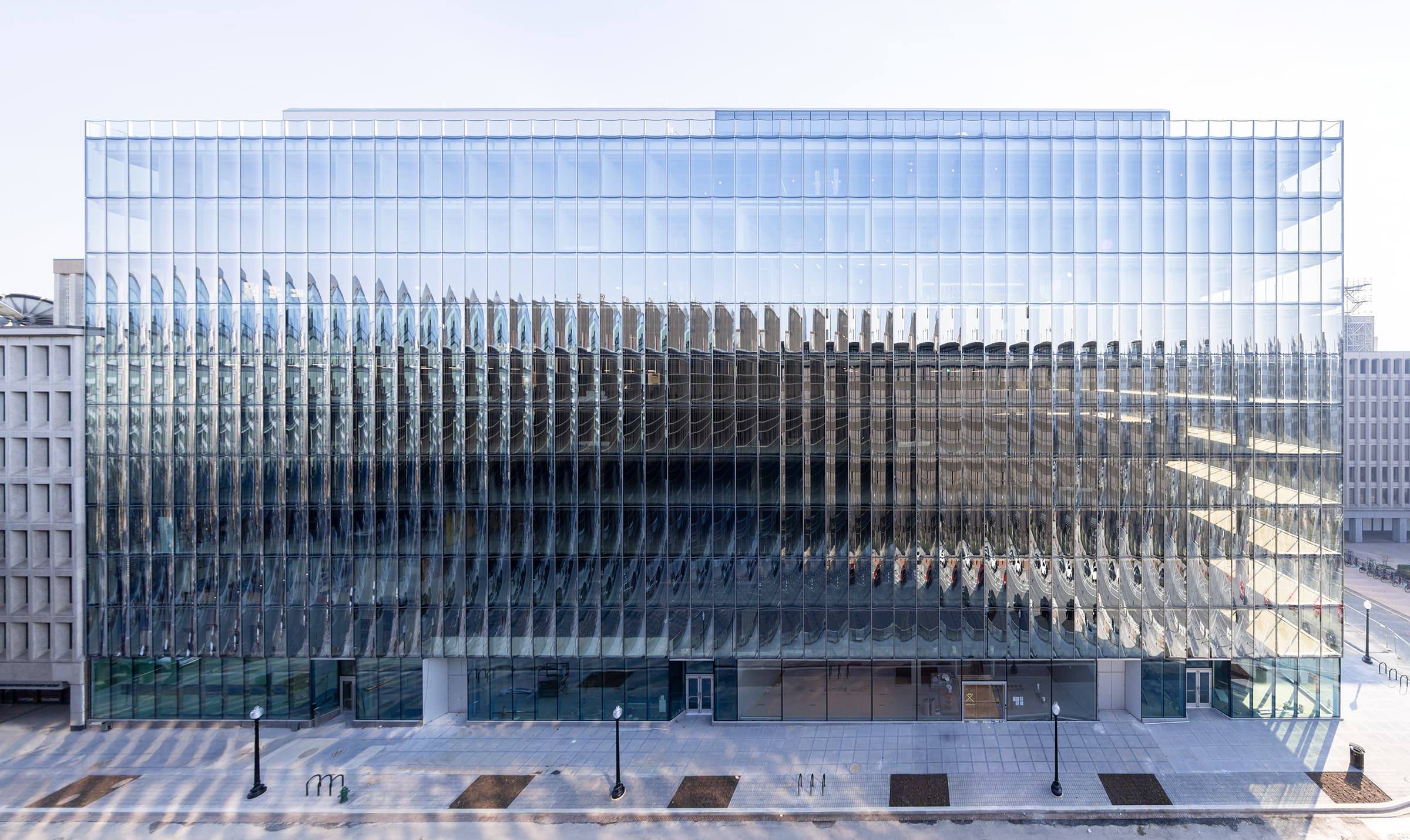 The façade, which is covered in almost 5,000 marble tiles that are half an inch thick, lets light shine through during the day and glow from within at night. The veined Estremoz Luminati Portuguese marble was laminated on both sides with glass and integrated insulated panels. As a result, light can flow through the stone-glass panels while maintaining energy efficiency and shielding the marble from weather-related degradation.