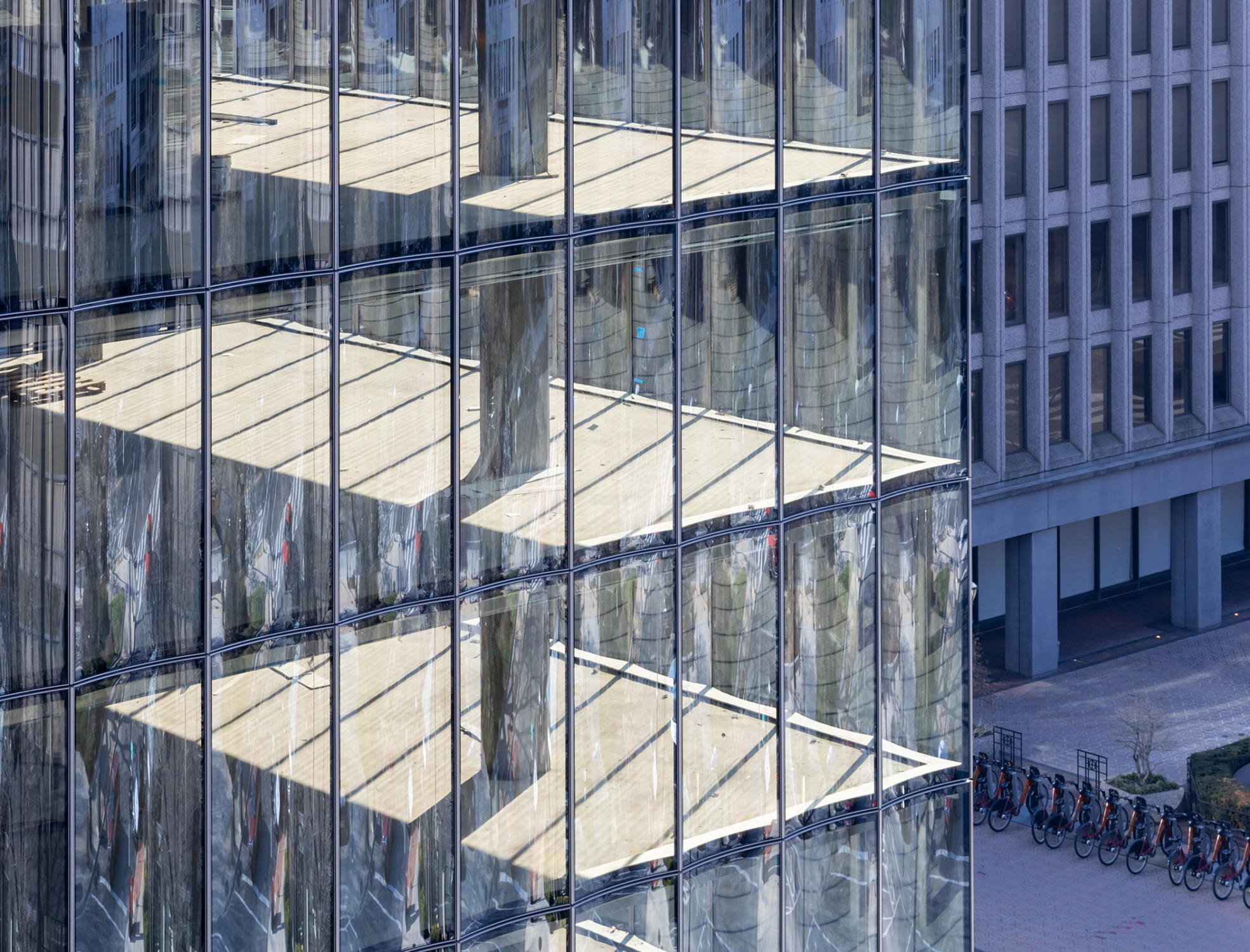 To reduce solar gain and meet thermal performance requirements, the insulating cavity is coated with a high-performance, low-E coating, and the glass is treated with a subtly reflective pyrolytic coating on the outside. The architects claim that the unusual kaleidoscopic effect of repetitive transparency and reflection that is created by the coating and curves “both animates and dematerializes the façade.”