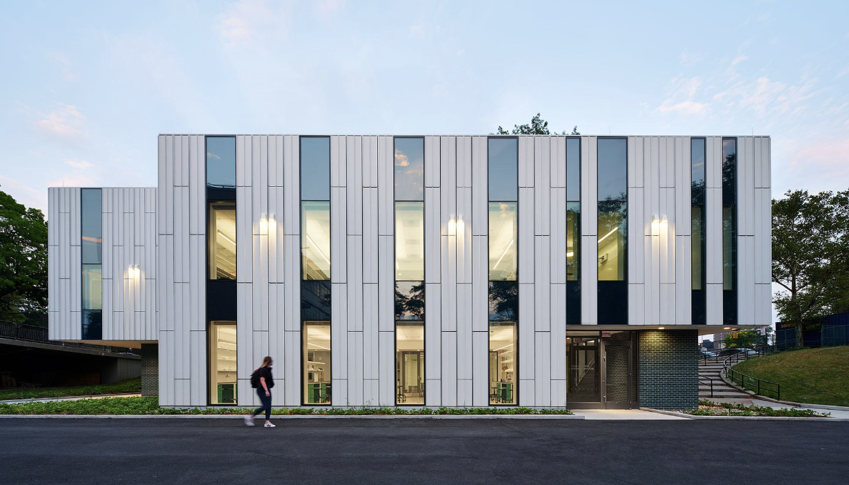 The façade is made up of fiber-reinforced concrete panels that are closely spaced and dotted with modular openings that correspond to the sensible and condensed laboratory layouts. Three-dimensional panels create changing and dynamic shadows on the façade throughout the day. The school’s color, bright green brick accents, line the main stairway and lobby and mark the entrances. The entire building’s systems are electric, and by obtaining electricity from renewable resources, the laboratory’s operations will be carbon neutral. Therefore, it is expected that the project will achieve net-zero emissions by 2050, meeting New York City’s strict carbon emission goals.