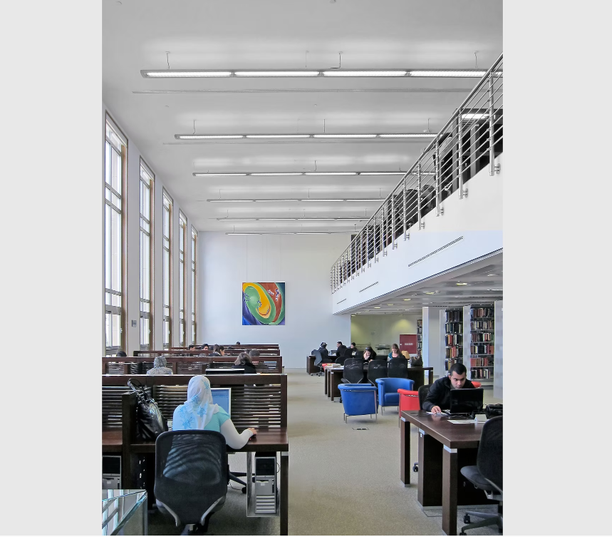 The Nassar Library features classrooms, computer zones, an expansive open collection, compact storage for the university’s extensive book collection since 1847, as well as lounge spaces, study rooms, and designated reading areas. APT served as the design architects, while SKP took on the role of architect of record.