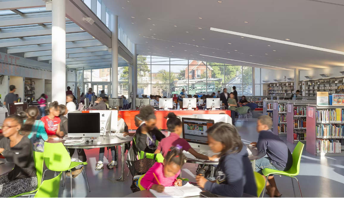As the neighborhood’s first civic and library building, it serves as a vital community hub, offering spaces for reading, computer access, job searches, after-school programs, and training. It also fulfills the traditional library role of preserving books.
