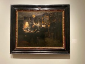Room after room, style after style I was blown away by the creativity of humans beings, but uttermost I was impressed by the collection displayed at “Robert and Luanne Pollack” Gallery, specifically two art pieces that gain my attention by opposite traits , the first one was Viggo Johansen painting “My Friends” which executed a lovely depth and detail while portraying a night scene of a group of fri ends illuminated by couple candles and a small dining chandelier, The other impressive piece was “Water Mill” by Frits Thaulow which executes and captures greatly light through reflexion.