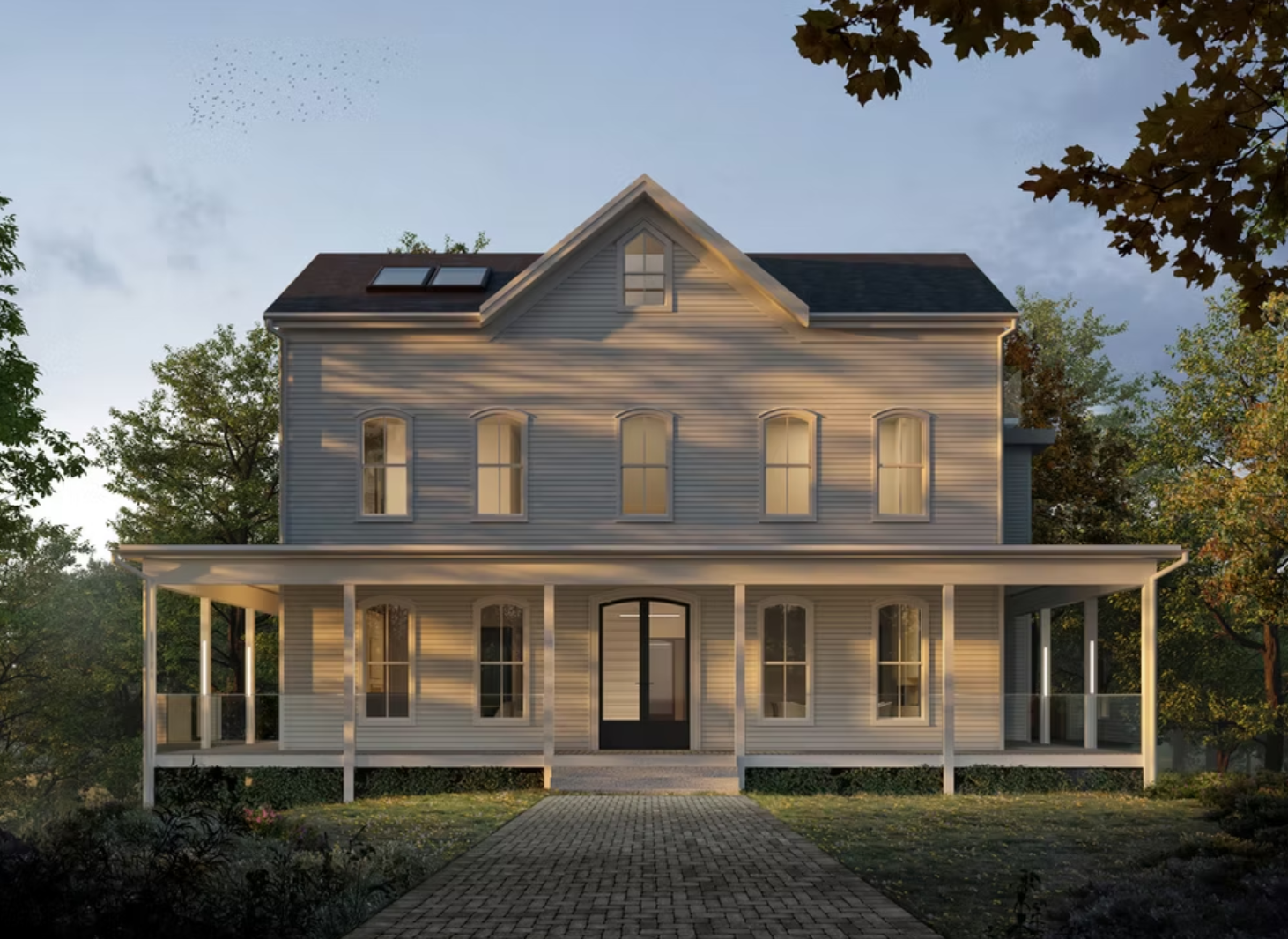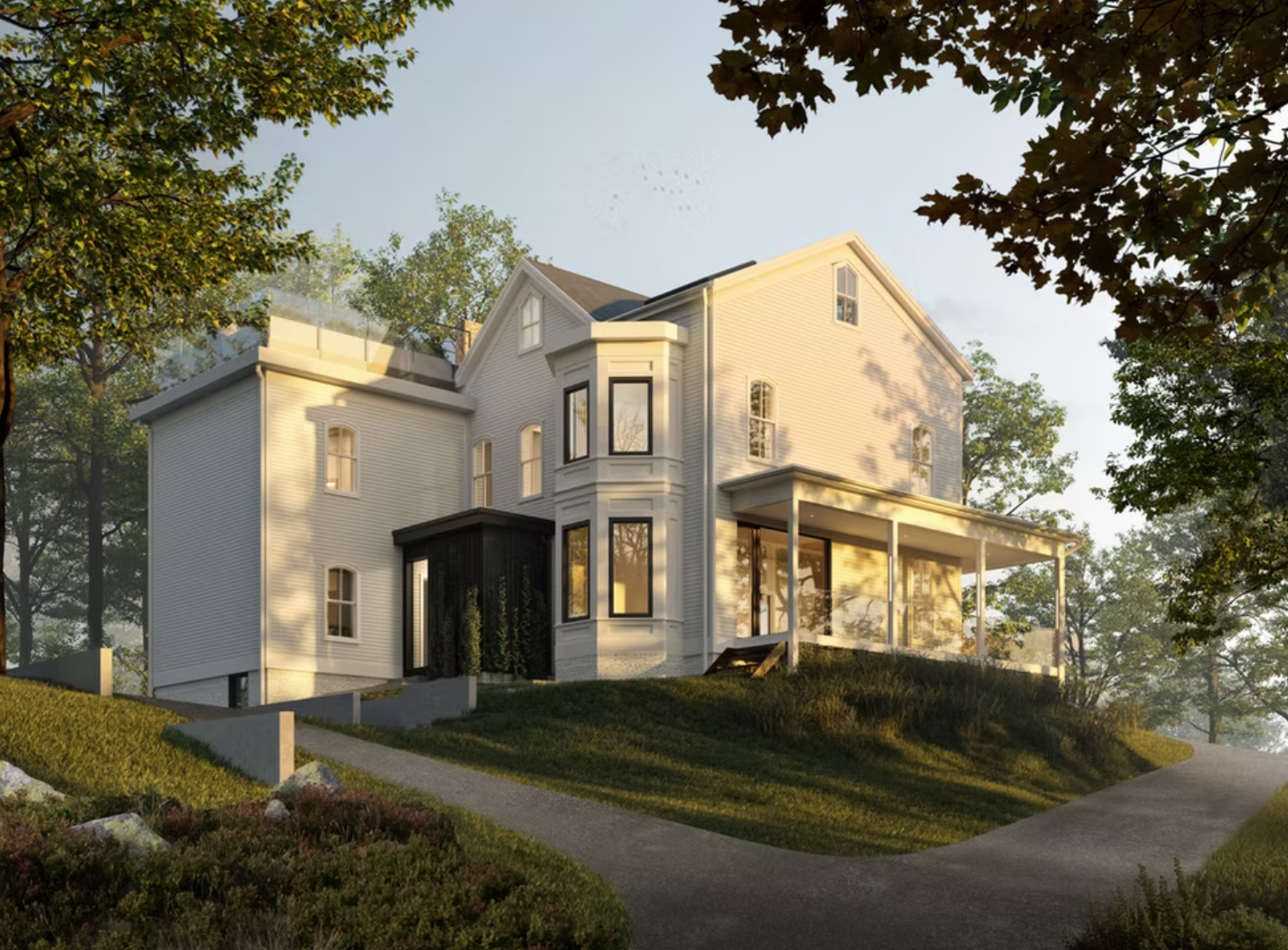 Originally built around 1870, this historic home sits atop a hillside 25 miles north of Manhattan, offering sweeping views of the Hudson River. The wraparound porch and arched windows were restored and updated to better showcase the surrounding landscape. Above the porch, original clapboard siding was replaced with new siding, substrates, and weather barriers. The aging brick and stone foundation was meticulously repaired and re-pointed after years of deterioration. Interior improvements included comprehensive insulation upgrades to enhance energy efficiency. The first floor features the kitchen, living area, and social spaces, while the second floor contains private bedrooms, including the primary suite with an en-suite bath, shared bathroom, and laundry. The third floor houses a guest room and studio, where newly added skylights capture extended views along the river. Construction is currently in progress.