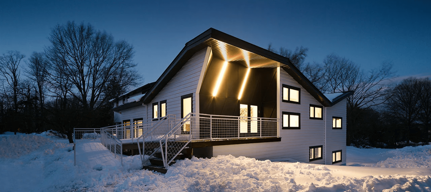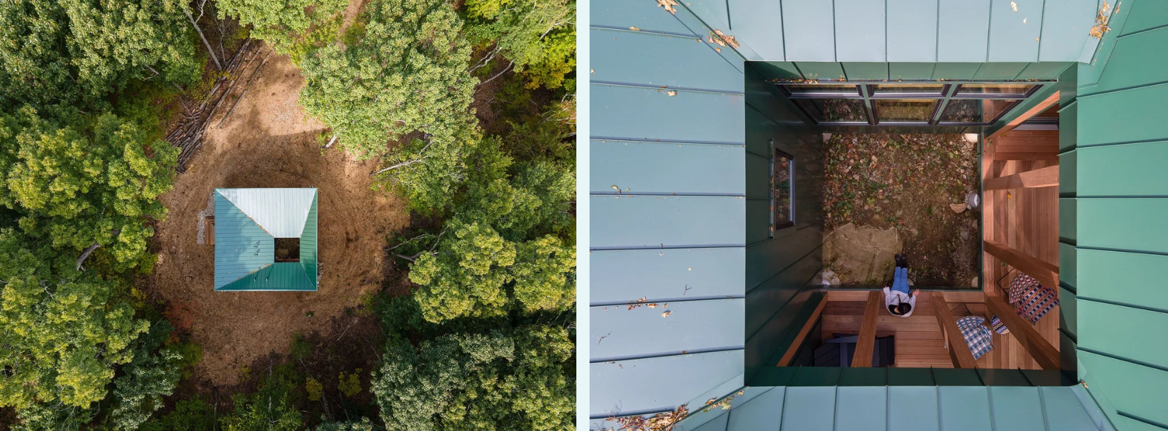 Built almost entirely from wood and insulated with sustainable materials, the retreat features large openings that respond to seasonal light and wind. A sculpted roof concavity collects water and enhances ventilation, while a central courtyard frames a boulder and connects the interior to the forest. This impluvium becomes a contemplative space, celebrating the natural cycles of rain and snow and anchoring the home within its landscape.
