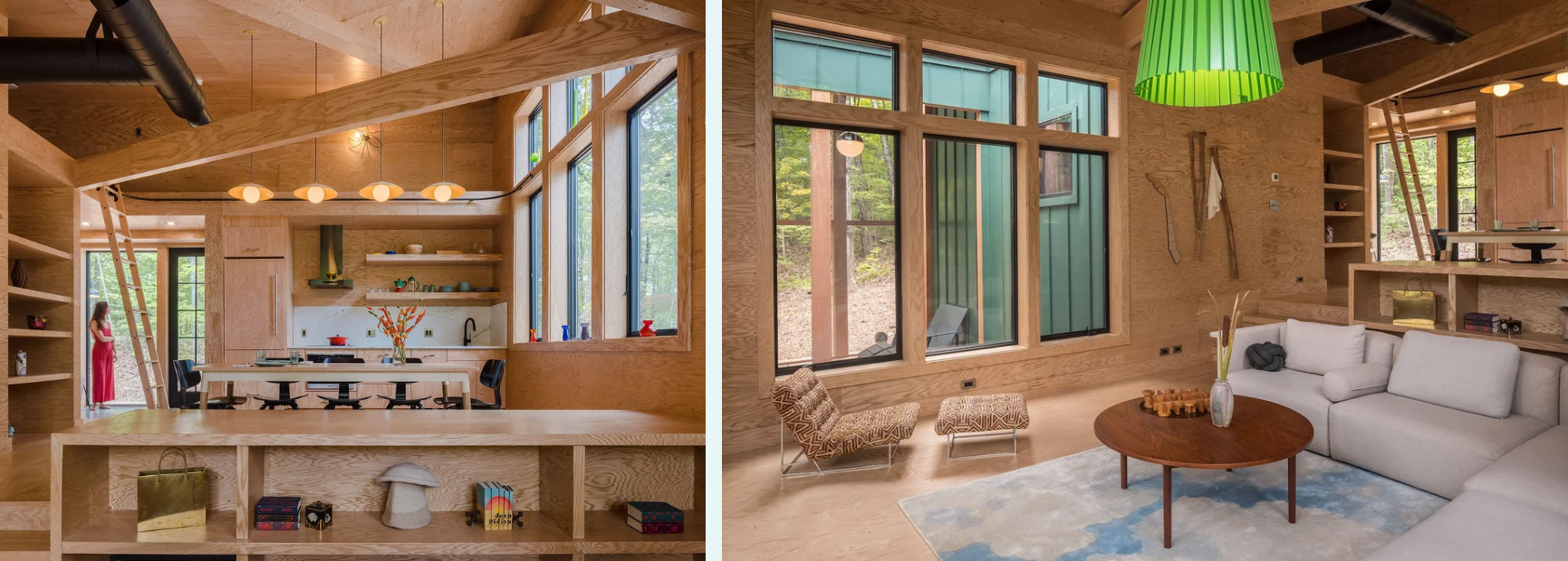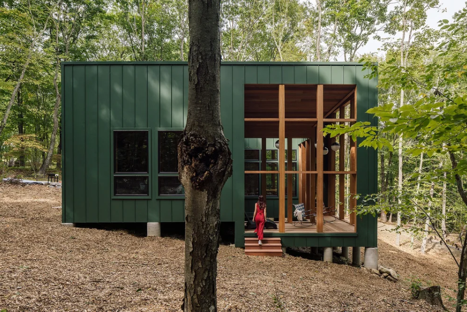 Set in a secluded East Coast forest, this 1200-square-foot retreat for a family of creatives is designed with minimal environmental impact. Accessible only by foot or light vehicle, the compact structure adapts to its rocky, sloped terrain with stepped living spaces, two bedrooms, a loft, and a southeast-facing porch.