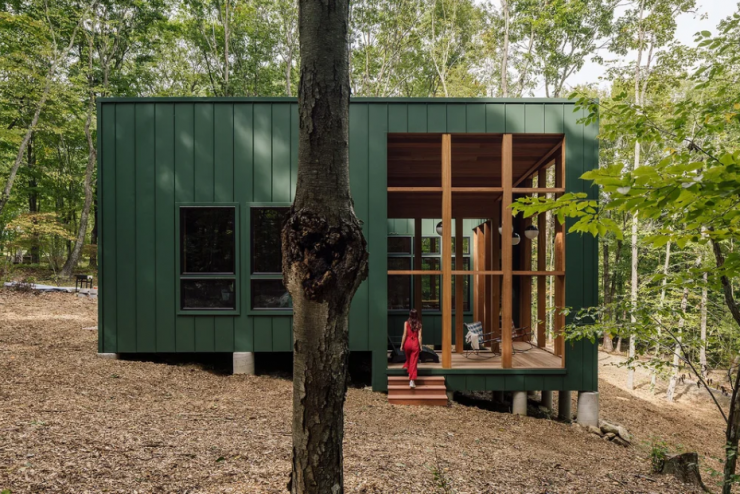 Set in a secluded East Coast forest, this 1200-square-foot retreat for a family of creatives is designed with minimal environmental impact. Accessible only by foot or light vehicle, the compact structure adapts to its rocky, sloped terrain with stepped living spaces, two bedrooms, a loft, and a southeast-facing porch.