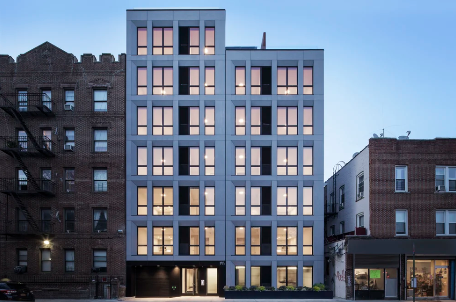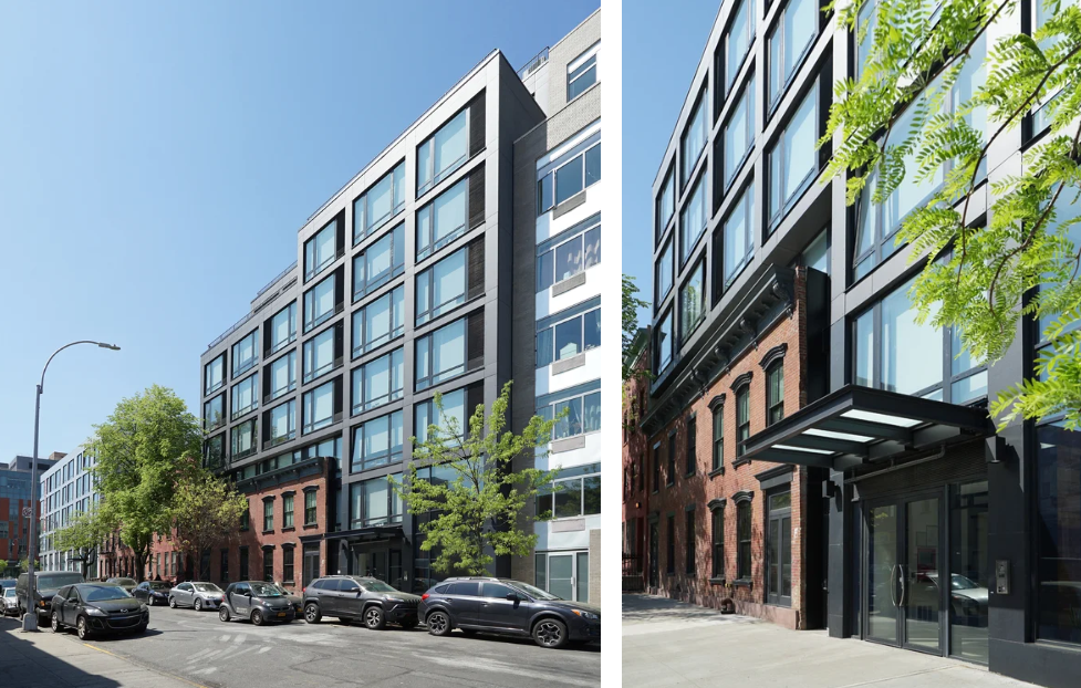 This is an eight-story residential building in Clinton Hill with about 40,000 square feet of space and 43 residential units. The firm preserved two historic townhouse façades and framed them with a clean, restrained modern structure that complements the neighborhood’s character. Amenity spaces include a community room, gym, rooftops, and garden areas—offering a mix of studio, one-bedroom, and two-bedroom units that respond to both demand and context.