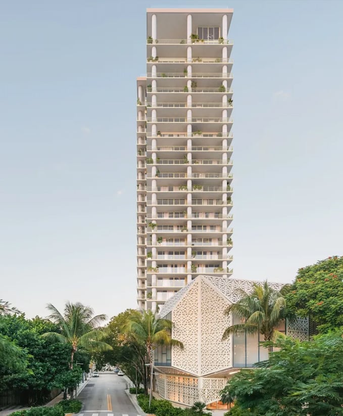 The building is divided into two main volumes and is completely enveloped by continuous terraces, defined by fluted white ceramic columns that run the entire height of the building. The crown and lobby are designed as double-height spaces, while integrated planters soften the presence of the complex. According to the team, the design seeks to capture and reflect Miami’s characteristic light, reinforcing the relationship between architecture, climate, and the urban environment.